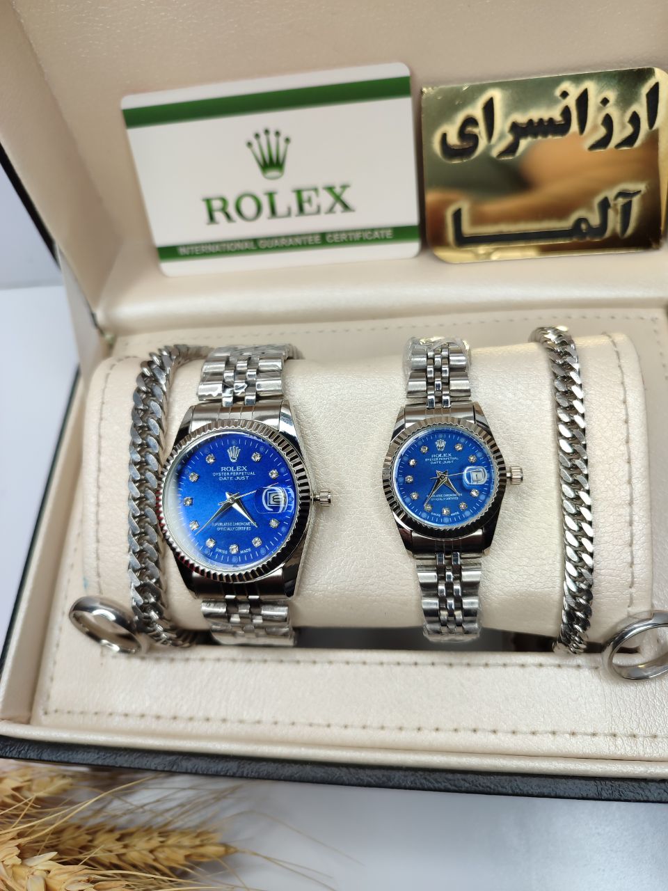 ست ساعت رولکس صفحه ابی دستبند و حلقه گارانتی ارسال رایگان